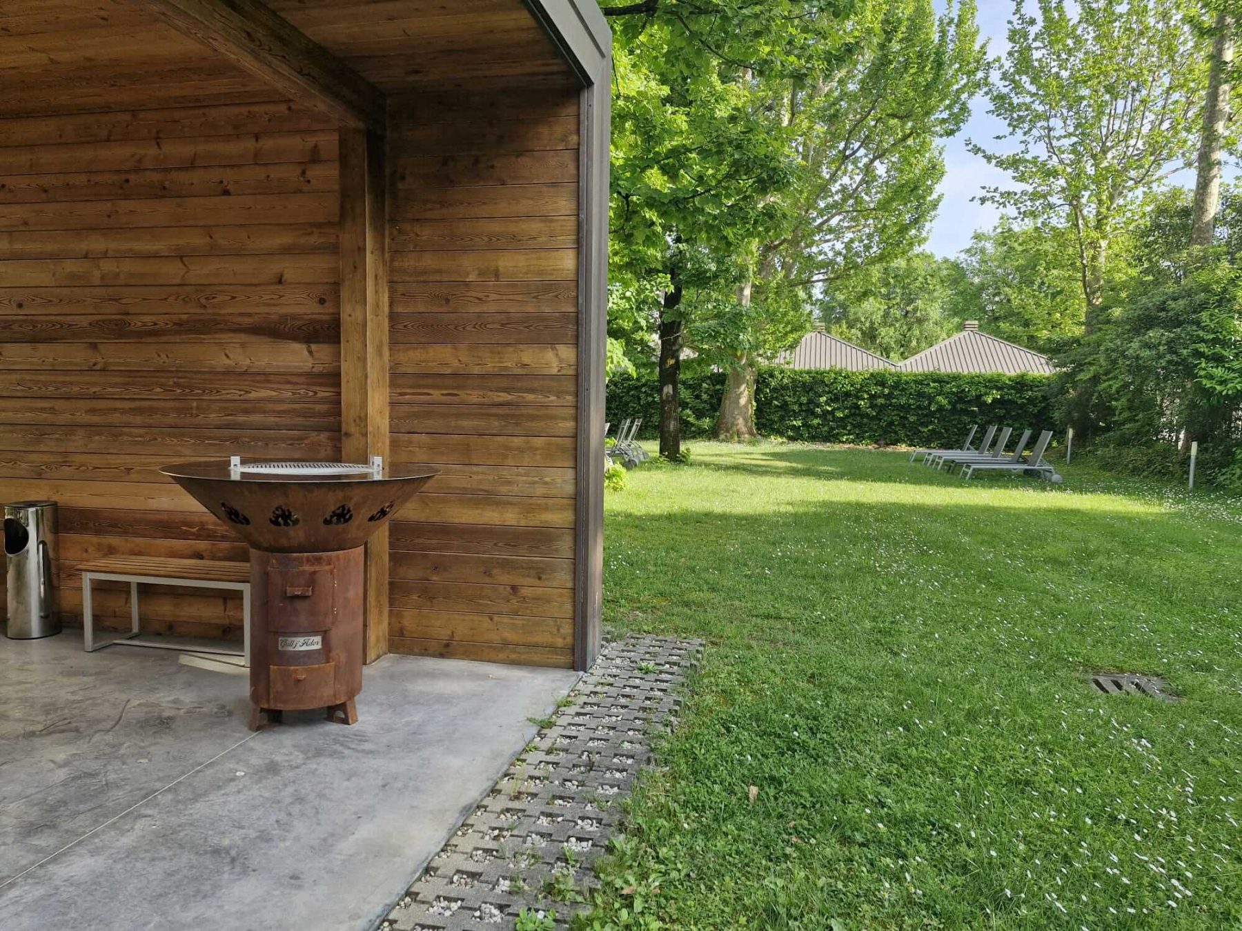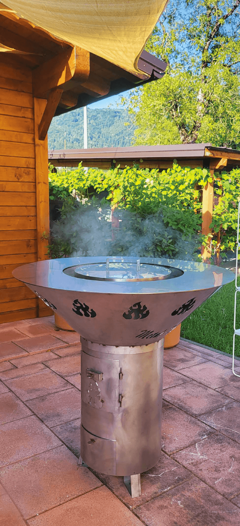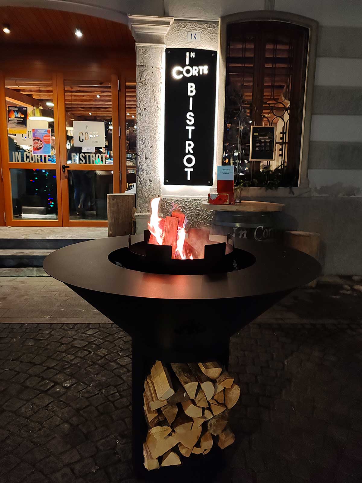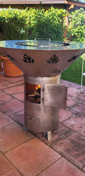Una struttura conviviale ispirata al vecchio fogolâr friulano, con un braciere centrale che diffonde calore per le serate più fresche. Puoi appoggiarti con mani e bicchieri lungo l’anello circostante senza scottarti, grazie all’inserto del braciere isolato dalla struttura.