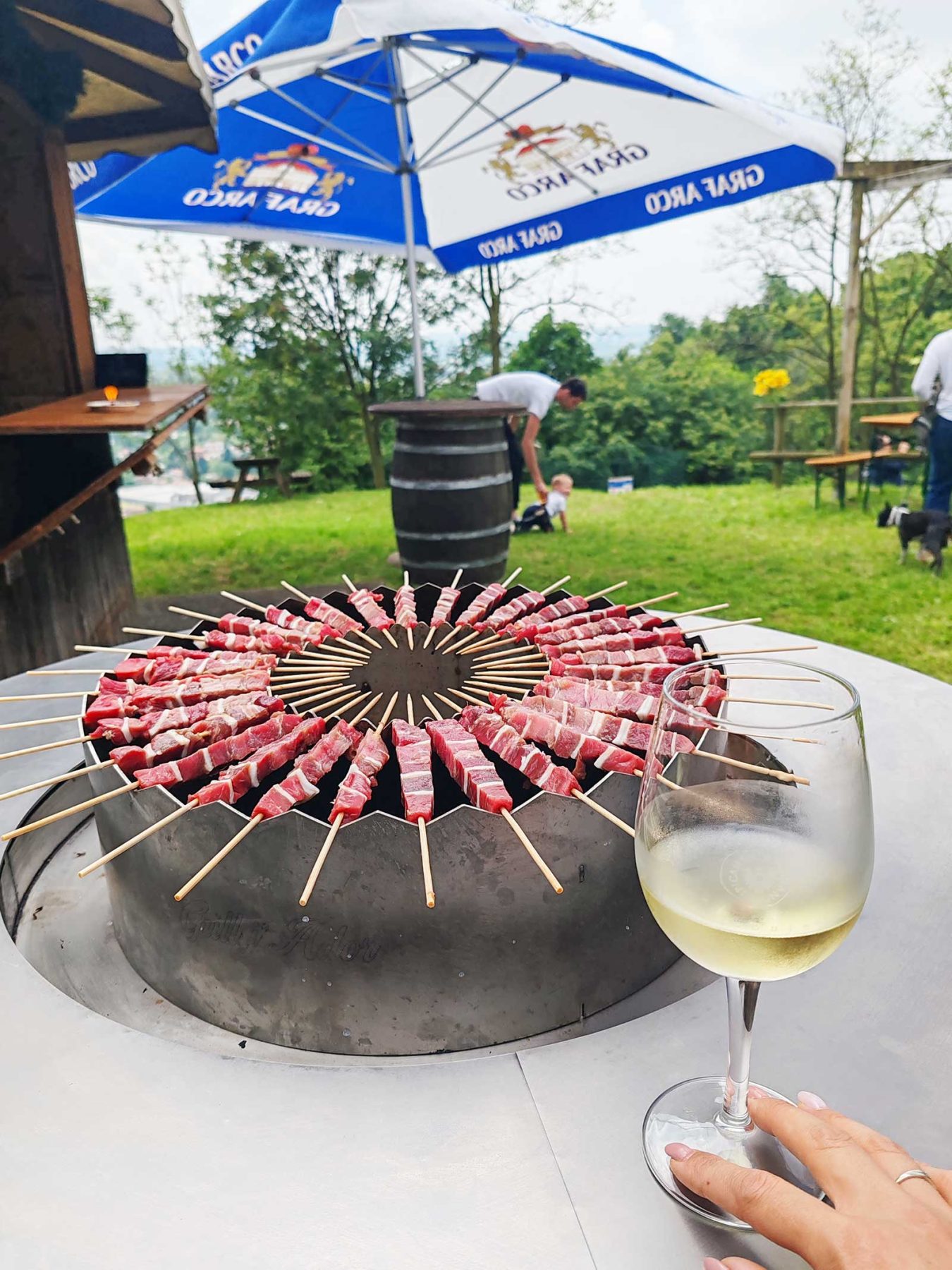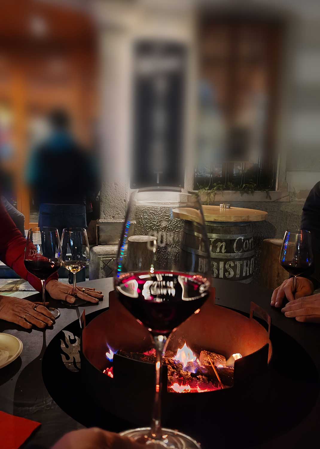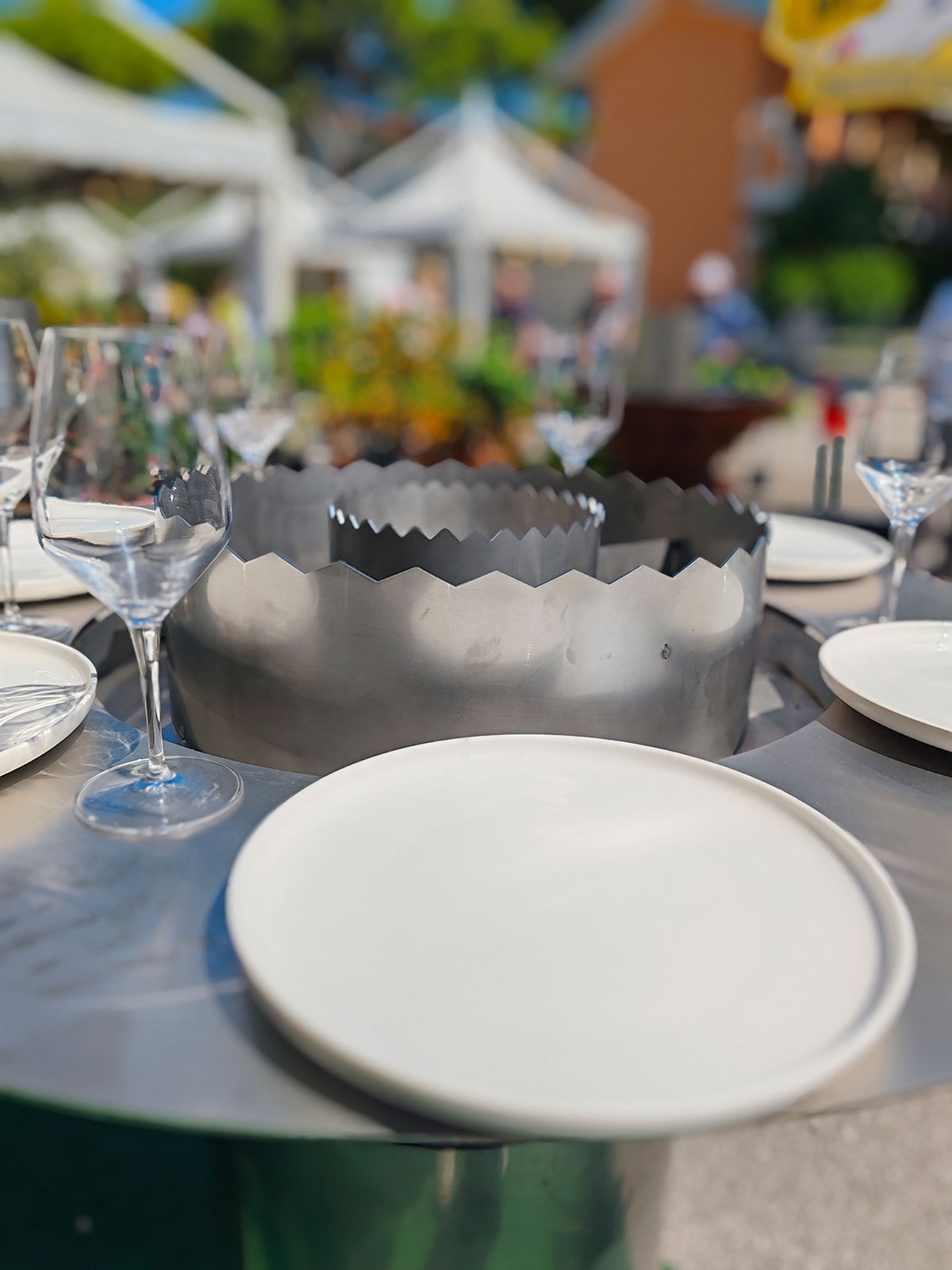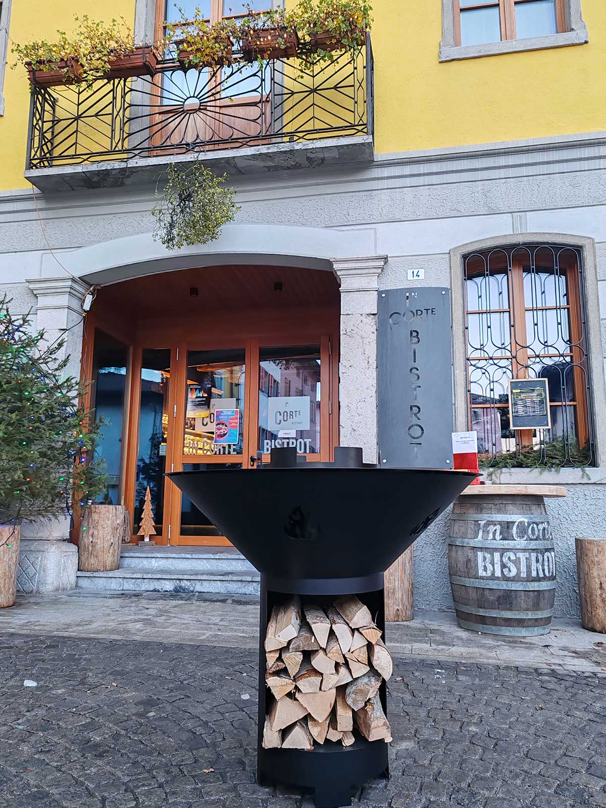 Una struttura conviviale ispirata al vecchio fogolâr friulano, con un braciere centrale che diffonde calore per le serate più fresche. Puoi appoggiarti con mani e bicchieri lungo l’anello circostante senza scottarti, grazie all’inserto del braciere isolato dalla struttura.