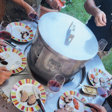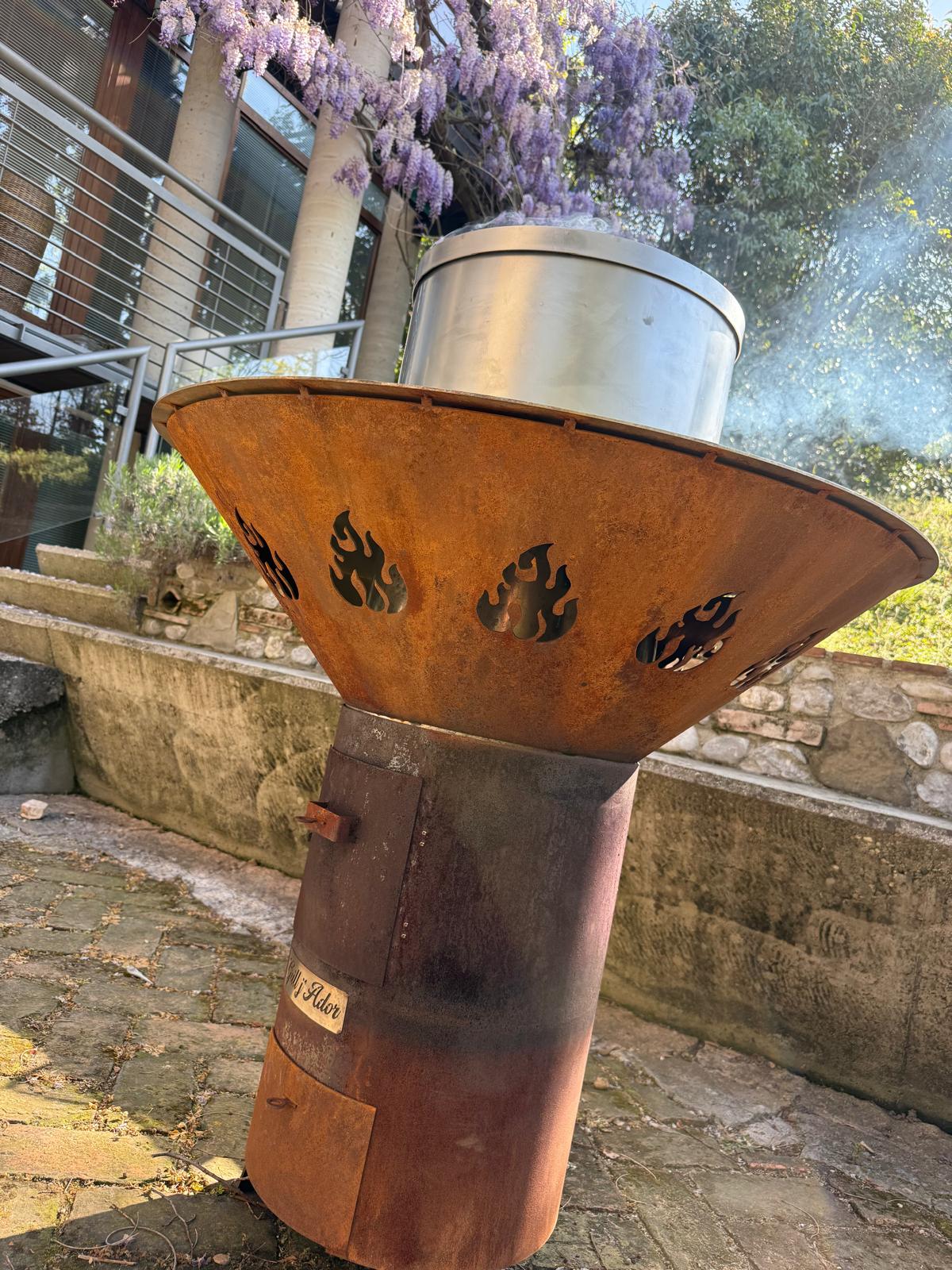 L’anello esterno superiore non riceve il calore diretto, poiché quest’ultimo viene convogliato nella parte centrale, dove si colloca la piastra grill, l’affumicatore o la straordinaria corona per arrosticini.